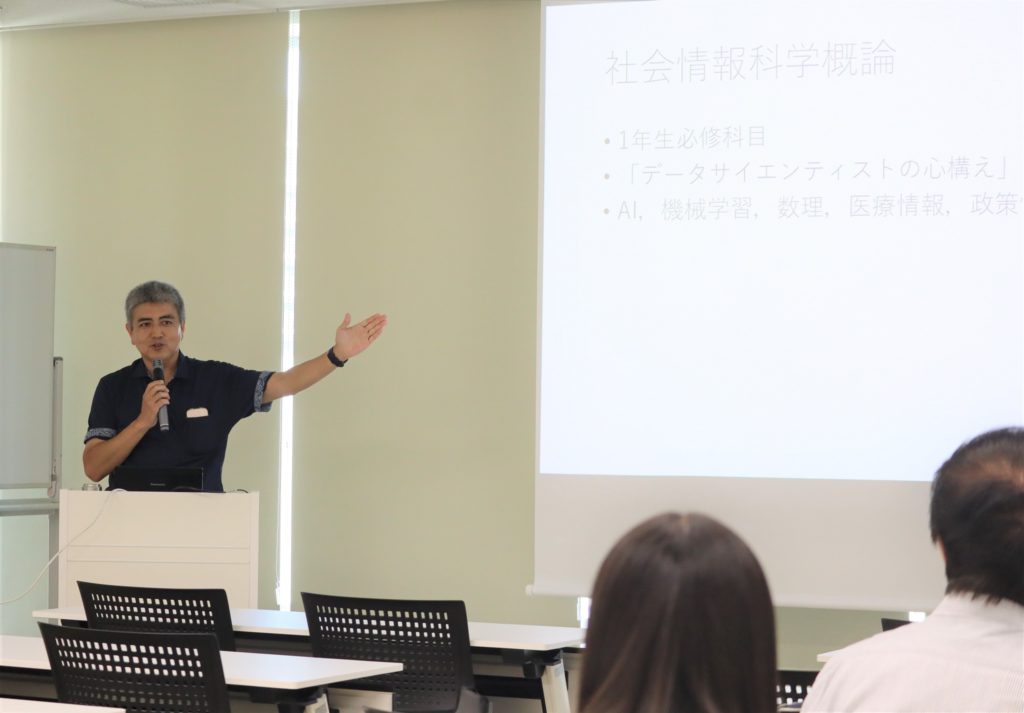 「教員による模擬講義」に、本学社会情報科学部の笹嶋宗彦教授と大阪成蹊大学データサイエンス学部の山西輝也教授が登壇し、学部概要やカリキュラム等を紹介しました。