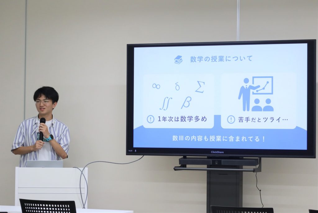 「学生デモセッション」には、本学社会情報科学部と大阪成蹊大学データサイエンス学部の学生が登壇しました。本セッションに登壇した本学のデータ分析研究会(通称:DA研)に所属する学生たちは、データ分析研究会の活動内容や社会情報科学部での学びの内容等について紹介しました。講演の中で学生たちは、高校で学ぶ数学の知識の中でも特に確率・統計、微分・積分については、データサイエンスを学ぶ上で大切なものであると強調し、「受験勉強は辛いものだが、大学入学後に受験勉強で学んだことを活かせるので、今のうちに頑張っていただきたい」と会場内の高校生に向けてエールを送りました。