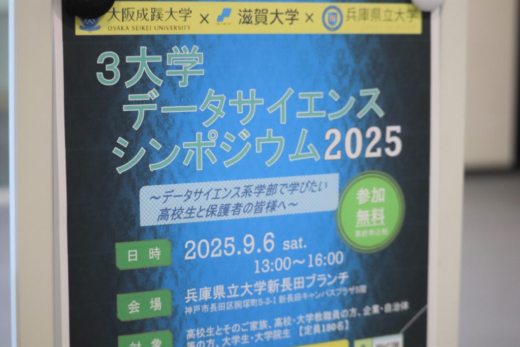 9月6日(土)、兵庫県立大学新長田ブランチにおいて、大阪成蹊大学・滋賀大学・本学の共催で「3大学データサイエンスシンポジウム2025」が開催され、高校生と保護者の方、高校教員の方など約60名の方にご来場いただきました。