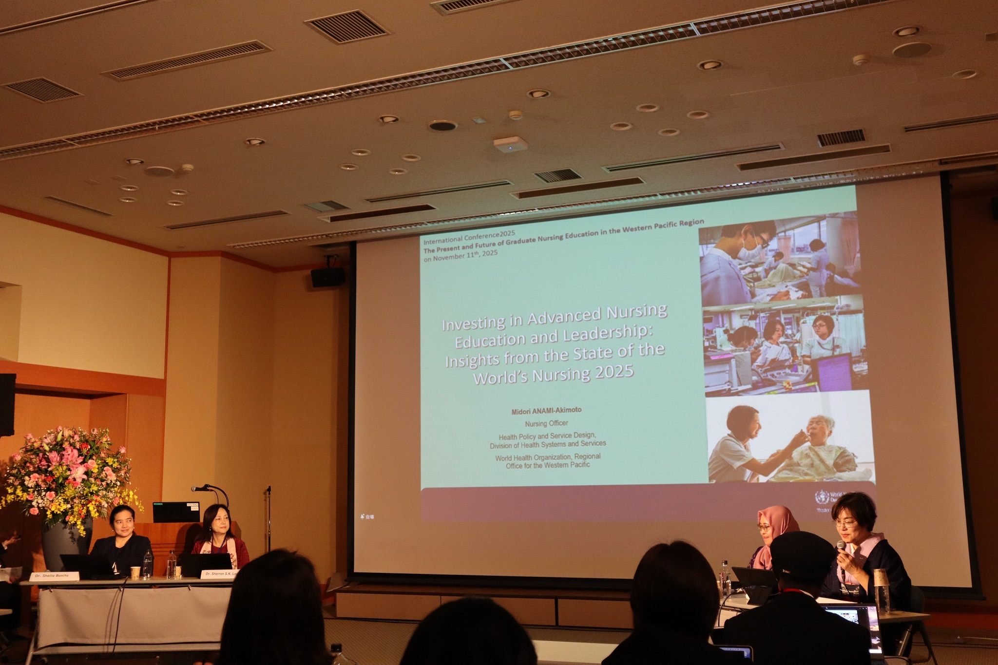 パネリストの方々による講演の前にリードオフスピーカーとして、WHO西太平洋地域事務局 看護専門官の穴見翠氏から「Investing in Advanced Nursing Education and Leadership :Insights from the State of the World’s Nursing 2025(高度な看護教育とリーダーシップへの投資:2025年の世界看護の現状からの洞察)」についてお話しいただきました。WHOの報告書『世界の看護の現状2025』から得られた知見が紹介され、高度な看護教育とリーダーシップへの投資がレジリエントな医療システムの構築に不可欠であることを、西太平洋地域の進捗状況と今後の方向性を交えて強調されました。