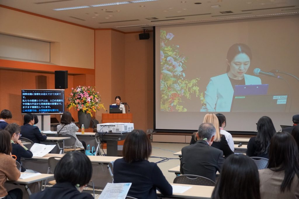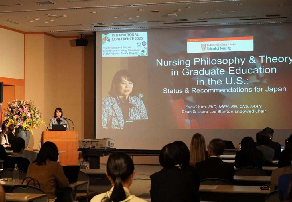 基調講演では、本会議と同日に本学看護学部とMOUを締結した米国のテキサス大学オースティン校看護学部の学部長で、女性の健康や健康格差、テクノロジーを活用したケア研究の国際的第一人者であるイム・ウンオク教授にご登壇いただき、「Toward the Future of Graduate Nursing Education(看護系大学院教育の未来に向けて)」と題し、米国における看護哲学と理論の動向、米国の大学院教育における看護哲学と理論教育の現状と課題、また、これらの課題に基づいた世界全体の大学院教育の将来に向けた提言について、ご講演いただきました。