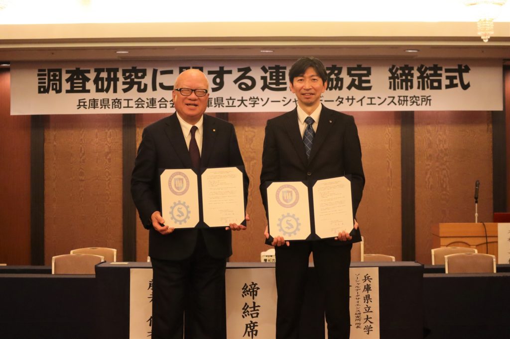 兵庫県立大学ソーシャルデータサイエンス研究所と兵庫県商工会連合会(神戸市中央区)は、地域活性化に向けて地域経済や諸産業の動向、地域中小企業・小規模事業者の実態等に関する調査・研究およびその成果の普及等において連携し協力することを目的として、連携協定を締結することとなり、12月11日(木)に神戸市内で連携協定締結式が行われました。