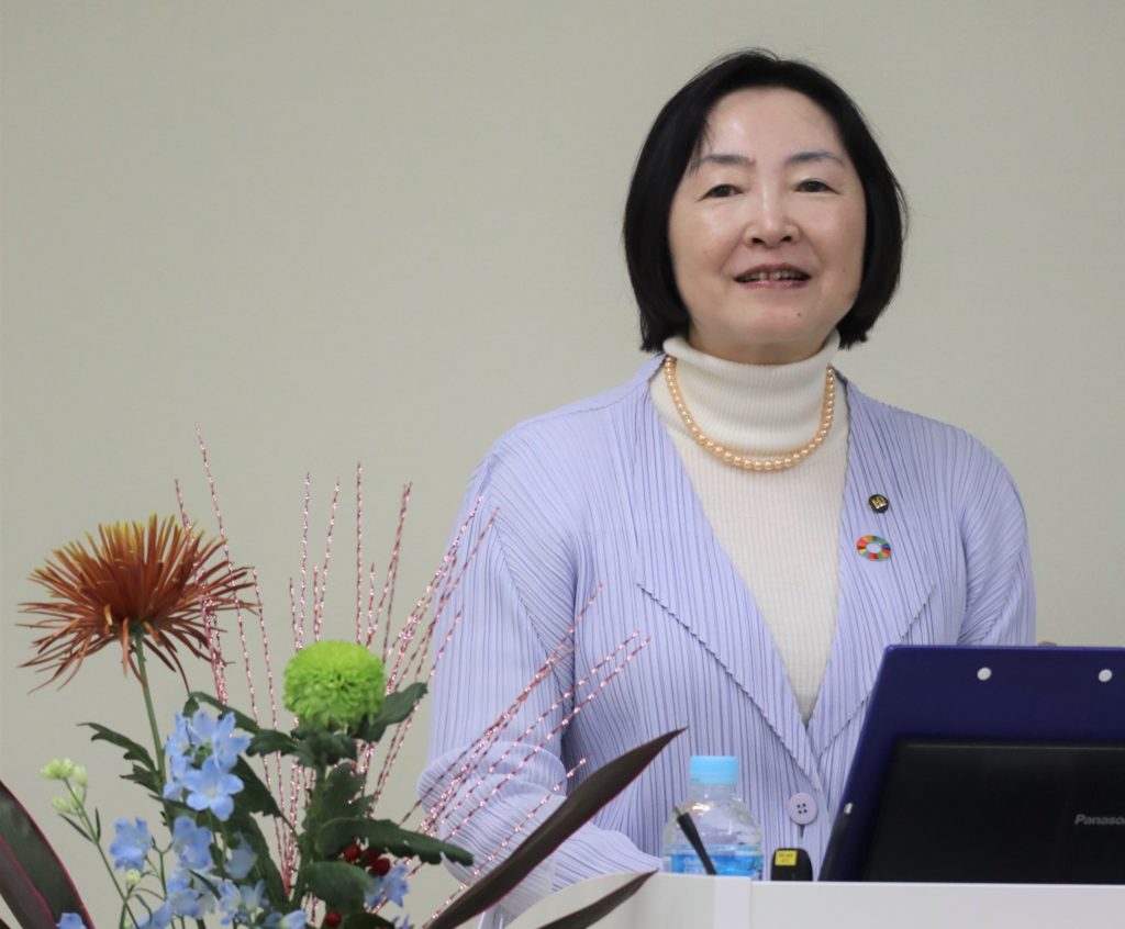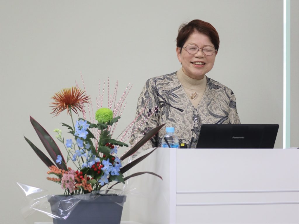 続いて、坂下玲子副学長から開会の挨拶がありました。坂下副学長は挨拶の冒頭で森口名誉教授に祝意を表し、「特に、インドネシア・南スラウェシ州のフィールドで、2001年から地域看護推進プロジェクトを計画され、プライマリ・ヘルスケアを推進する人材育成と仕組みづくりを現地の方々と粘り強く進めてこられたことが、今回の受賞につながっているのではないかと思うし、そのモデルは今や、インドネシア全土に広がり、発展していることも素晴らしいことだと思う。森口先生は『すべての人々に健康を』というプライマリ・ヘルスケアの理念を大切にされ、地域住民の主体的な参加と自己決定を尊重されながら活動を広げてこられた。また、このたびの受賞に際しては『長年にわたり、活動を継続できたのは関係者の協力のおかげ』と仰っている。国際協力は1人の力ではなしえない。だからこそ、相手を尊重し、ともに育ち、ともに進んでいくということを、森口先生が実践され、看護の本質を私たちに示してくださったのではないかと思っている」と述べました。