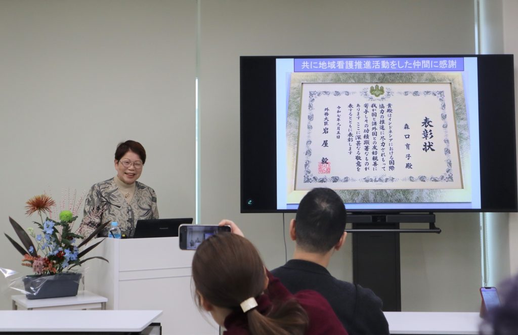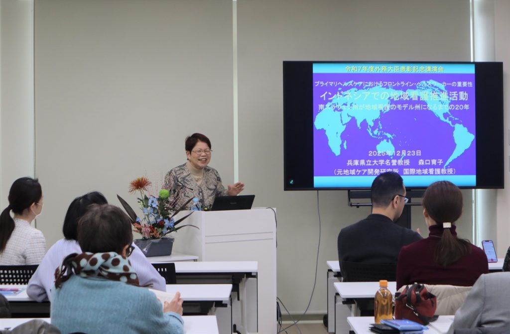 元地域ケア開発研究所 国際地域看護学教授の森口育子名誉教授が、長年にわたりインドネシアにおける国際協力の推進に貢献してきたとして、2025年9月5日付で令和7年度外務大臣表彰を受賞されたのを記念し、12月23日(火)、兵庫県立大学新長田ブランチにおいて、地域ケア開発研究所の主催で「令和7年度外務大臣表彰記念講演会」が行われました。