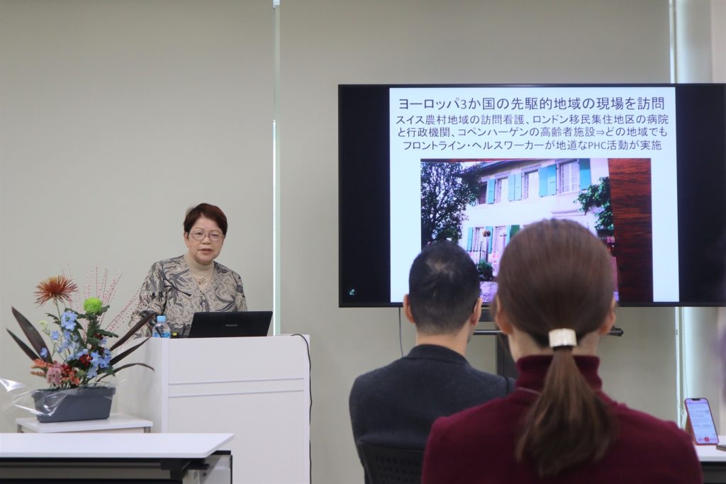 中でも、国際地域看護の人材育成への取組の契機となった出来事の1つに、21世紀におけるプライマリ・ヘルスケアの方向性を求めて2000年6月から10月にスイス・ジュネーブにあるWHO本部で短期コンサルタントとして行った在外研究を挙げました。「2000年はちょうどSDGsの前身の『ミレニアム開発目標(MDGs)』が始まり、21世紀の入口として非常に大きな節目だった。一方で、プライマリ・ヘルスケアの方向性を求めてWHO本部に行ったが、WHOは当時、HIV感染症(エイズ)とエボラ出血熱の感染拡大への対応に追われ、プライマリ・ヘルスケアの方向性を求められるような状況ではなかった。ただ、せっかく欧州に来ていたので、看護専門官にお話しし、欧州で地域看護の先進的な活動をしている地域を紹介していただいた。スイスの農村地域の訪問看護や、デンマーク・コペンハーゲンの高齢者施設の活動に参加したり、イギリス・ロンドンの移民族地域では、移民の看護師たちと一緒に家庭訪問をした。どの地域に行っても、フロントラインヘルスワーカーが地域での活動を地道にしており、フロントラインヘルスワーカーの存在・役割は大事だと感じた。もう1つ受けた大きな刺激は、デンマークにあるWHOヨーロッパ地域事務局を訪問した際に、そこでは旧ソ連崩壊後の東ヨーロッパにおける看護体制の再構築に尽力されていた。その様子を見て国際機関の役割の重要性を学ぶと同時に、『私にはとてもついていけないな』と自己の限界を感じ、アジアの地域看護の向上に専念しようと思った。WHO本部で活動するという良い機会をいただいた中で、今後の新たなチャレンジとして考えたことは、『アジアの地域看護指導者の育成』だった。プライマリ・ヘルスケアを国際的に継承し、大学院修士課程で高度実践者を養成したいと考えた。もう1つは、国際看護は自分1人ではできないので、一緒に国際地域看護に取り組んでいる仲間と国際地域研究会を立ち上げた」と森口名誉教授は話しました。