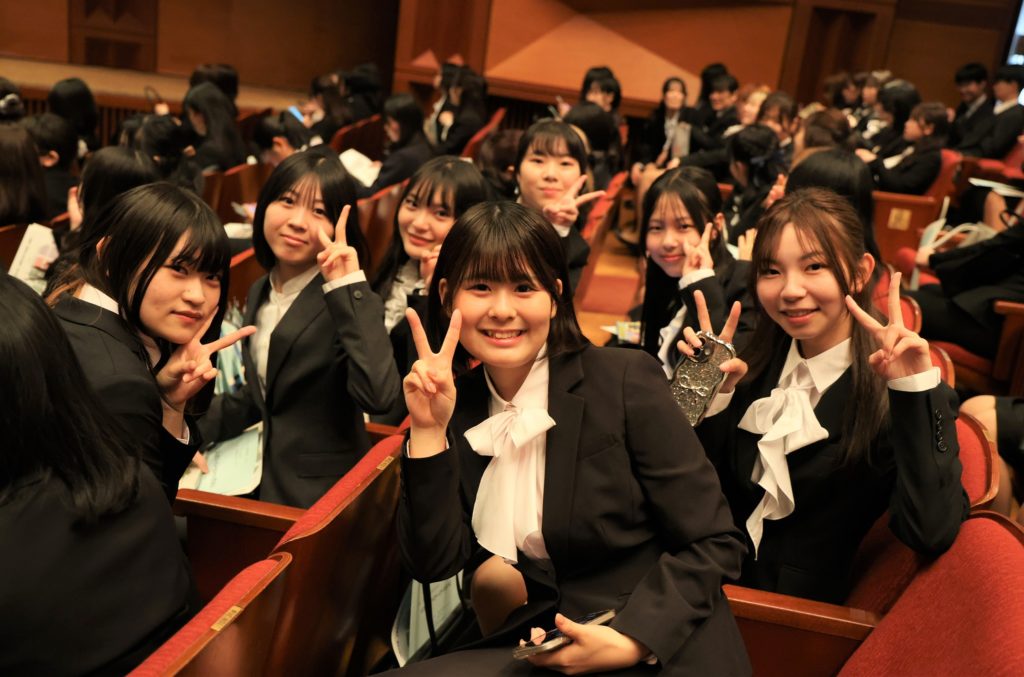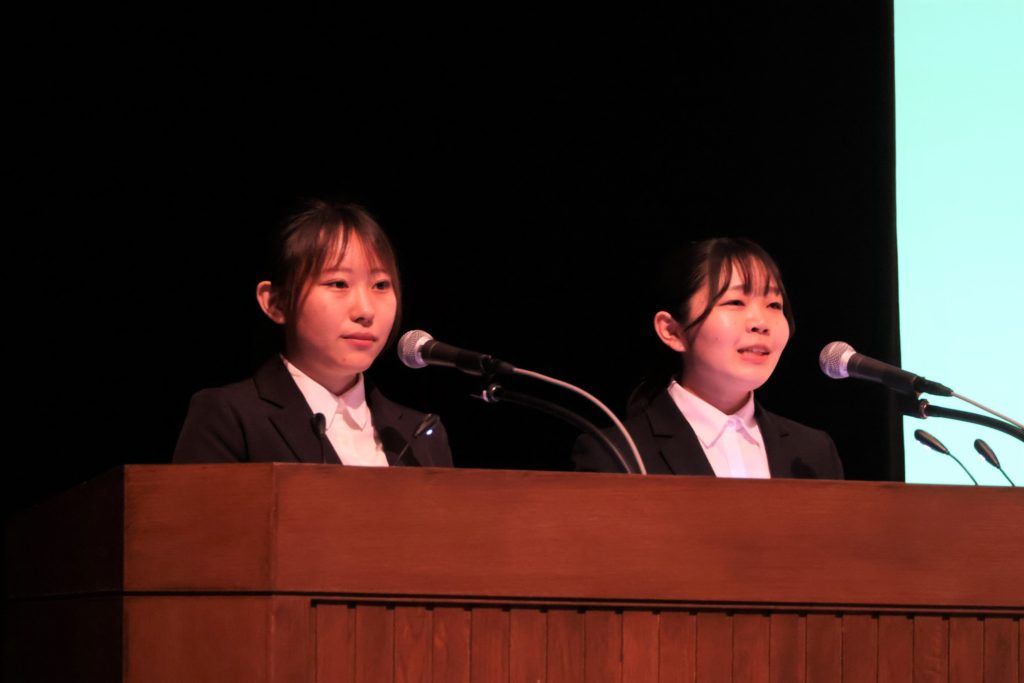 式典の司会・進行は、国際商経学部3年生の小野絹花さんと、環境人間学部4年生の岩本咲希さんが行いました。