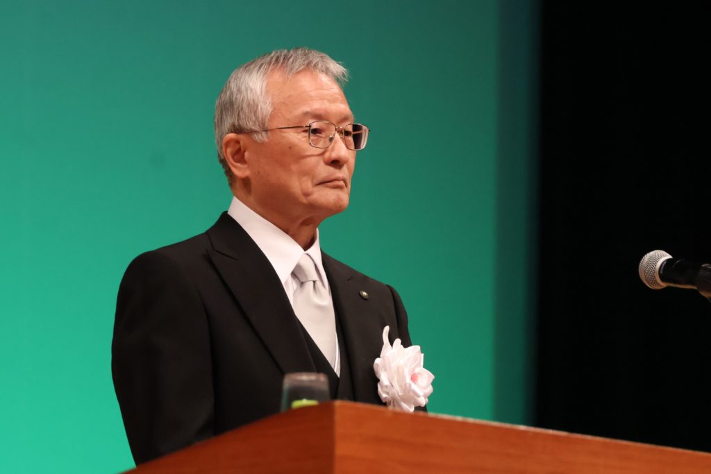 髙坂誠学長は式辞の中で、教育、研究、社会貢献の観点から大学の存在理由について言及し、「大きく変貌する時代と地域は、高度な専門性と深い教養、国際対話力とアントレプレナー精神を有し、自立したしなやかな知性を求めています。私たちは世界の学術機関と結び、学問の自由と調和を守り、そして、人々の間に壁を作るのではなく橋を架ける、他者に寄り添い痛みを分かり合うことのできる、地球の未来に責任をもつ若者を育てていきます。研究では、世界が直面するさまざまな課題の解決に、尖鋭的、実践的な研究活動を通して貢献することです。科学技術に国境はありません。学際的研究のグローバルハブとして、地域社会システムの中核インフラとして、産学官市民連携による総合知でイノベーションを加速させ、大学発ベンチャーなどを通して、その成果を広く社会に還元していきます。社会貢献では、豊かで多彩な未来社会のビジョンを示し、新たな価値と希望を生み出すことです。本学は、SDGsに謳われている”No one left behind(誰ひとり取り残さない)”の考え方を基底に据え、地域から信頼され世界に通用する学知の空間を目指して、学生ファーストの視点から創造的改革を進めます」と述べました。