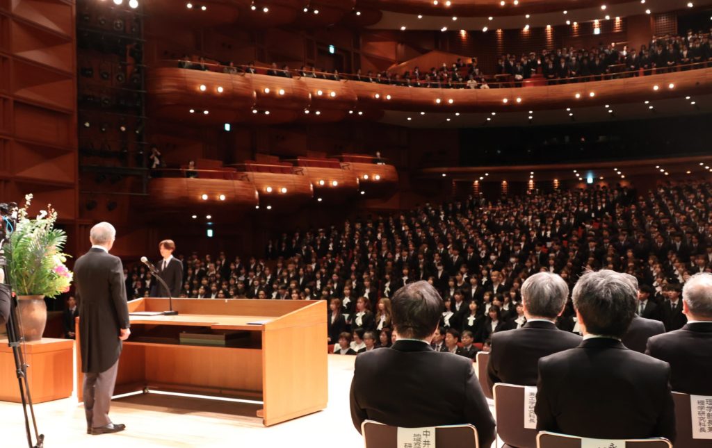 最後に、「大学は多様な感性を持った他者と出会い、自己を相対比できる場所です。大学時代に得た友人は生涯の友になると言われています。一期一会を大切に、切磋琢磨できる多くの学友に出会ってください。ともに迷い、ともに苦しみ、感動を分かち合い、恵まれた幸運に感謝しながら、手をたずさえて進んでください。苦しくて切ないときは、人を頼る勇気を持つことです。みなさんは私たちが未来に届ける大切な贈り物です。まだ見ぬ世界の鼓動を感じ、新しい風を大きな翼に変えて、さらに高く、遠くへと蒼空へと翔けてください」と語りかけました。